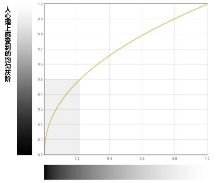 當(dāng)物理亮度達(dá)到白色的20%左右的時(shí)候,人眼中已經(jīng)感受到中灰色的概念。而剩下的一半高光區(qū)的灰階,需要用白色80%的物理亮度才能照亮成白色。