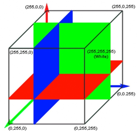 我們可以用一個(gè)立方體來表示RGB色彩模型,因?yàn)槲覀儎偛耪f了任意一種色彩都可以被拆分為R、G、B三個(gè)分量,同理,立方體中的任意一個(gè)點(diǎn)的位置坐標(biāo)也可以拆分為X、Y、Z三個(gè)分量,因此我們就可以利用立方體里面的某個(gè)點(diǎn)來表示某種顏色。
